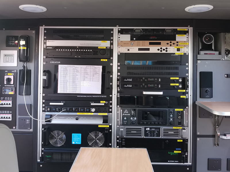 車內(nèi)平臺按功能分為三段,前部駕駛艙、中部操作艙、后部設(shè)備艙;操作艙設(shè)有兩個可旋轉(zhuǎn)座椅,方便進行通信設(shè)備操作;后部設(shè)備艙可配備電纜盤、發(fā)電機控制單元、UPS主機、蓄電池、雜物柜,設(shè)備配重布局合理,安裝平衡穩(wěn)固。